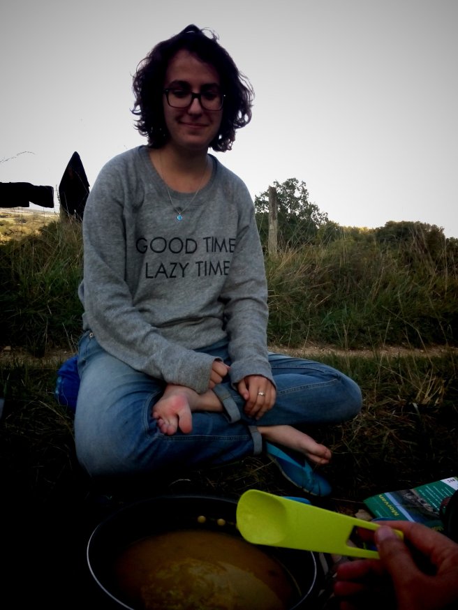 On s’est posées plus loin, à coté de moutons. Petite soupe (merci Marie), petites tartines de fromage frais. Pas de saucisson car j’ai réussi à perdre mon super couteau, le premier jour, avant même de m’en être servi, toujours normal.