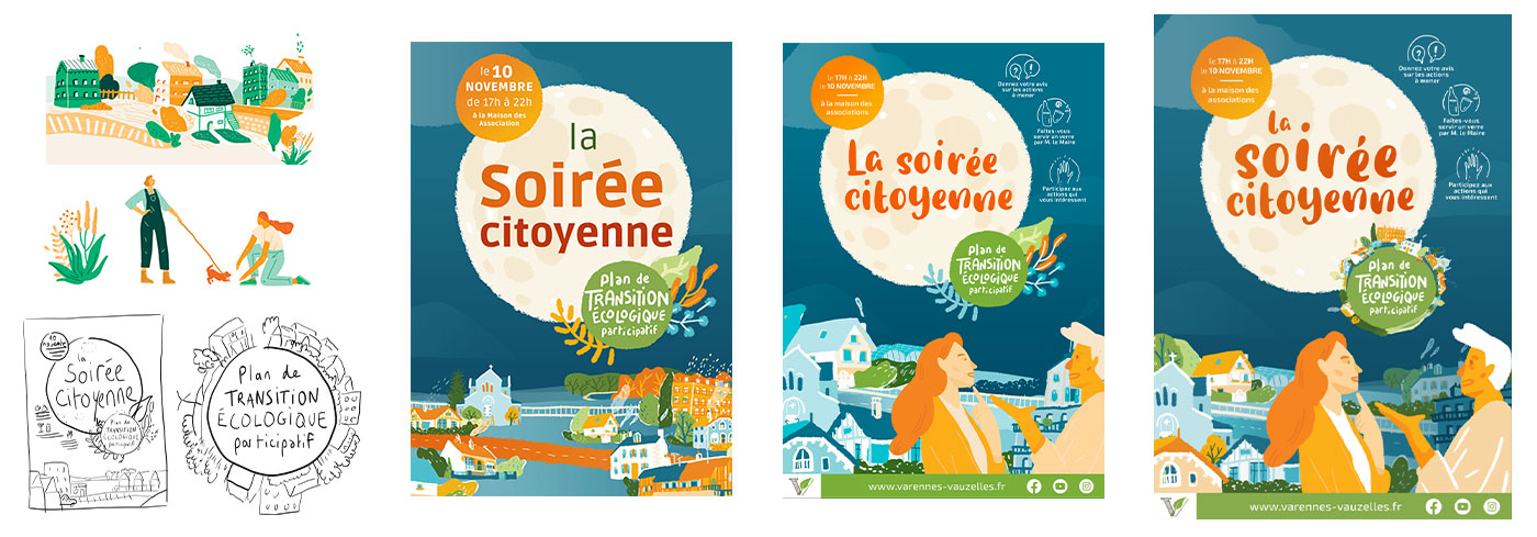 Hier, j’ai eu la satisfaction de terminer ma journée de travail avec le sentiment d’être arrivée à une bonne affiche, avec le plaisir ajouté d’une bonne collaboration. J’y passe certainement trop de temps par rapport à ce qui a été devisé, mais c’est aussi important de se faire plaisir et d’expérimenter le temps nécessaire pour une création libre et de qualité.