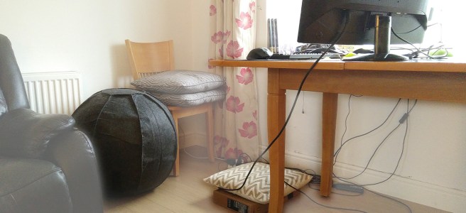 🇫🇷 Hier j'ai reçu mon nouveau siège de bureau : une grosse balle. Elle fait 65cm de diamètre, la bonne hauteur pour ma taille. Malheureusement le plateau de la table est beaucoup trop haut (d'environ 8-10cm). J'ai mis en place un genre dispositif pour rehausser la balle mais ce n'est pas très satisfaisant et j'ai … Lire la suite New chair